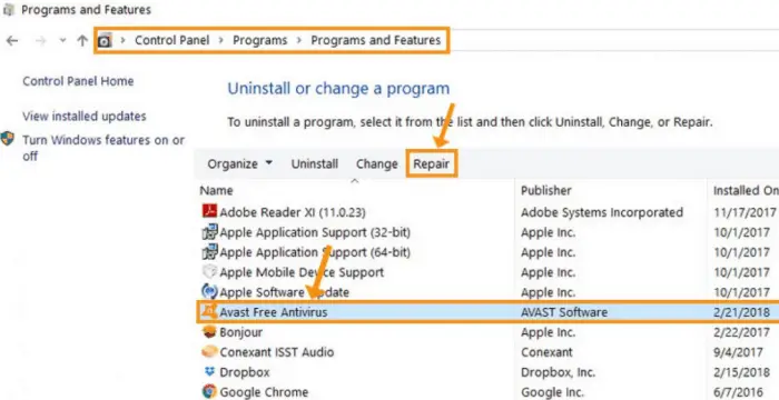 3. Find “Avast” in the dropdown list of installed programs and click on uninstall/change. Then click on the repair avast icon on top.