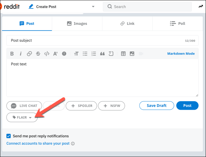 - Once you click on Create Post, a drop-down menu will be visible in the bottom left corner of your menu. Select Flair.
