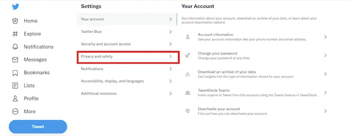 - Firstly, Open the website and click the more (horizontal three dots) button from the side menu. Secondly, Click on settings and privacy. Thirdly, Click on Account and further on. Twitter will ask you to type your password to know it’s you.