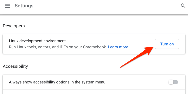 - Toggle the Turn On button under Settings > Developers > Linux development environment (Beta).